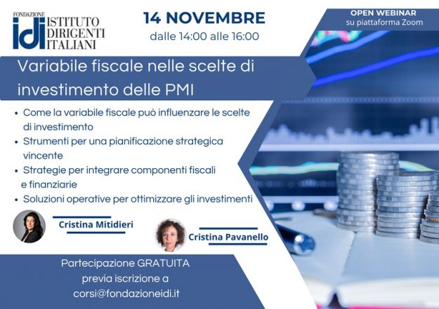 Il nuovo open webinar gratuito organizzato da Fondazione Idi (Istituto Dirigenti Italiani): “Variabile fiscale nelle scelte di investimento delle PMI”, è stato posticipato a Venerdì 21 novembre dalle 10:00 alle 12:00 a distanza. Per iscriversi, è sufficiente inviare una mail all’indirizzo corsi@fondazioneidi.it indicando: Nome – Cognome – Azienda – Ruolo svolto – Indirizzo…